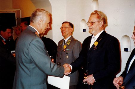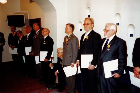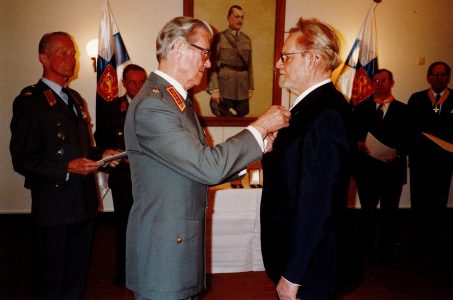 Kunniarajajääkäri ja perinnetoimikunnan pitkäaikainen puheenjohtaja Jaakko Jokela saa 3. luokan Vapaudenristin Pääesikunnan vartiotuvassa 1.6.2001